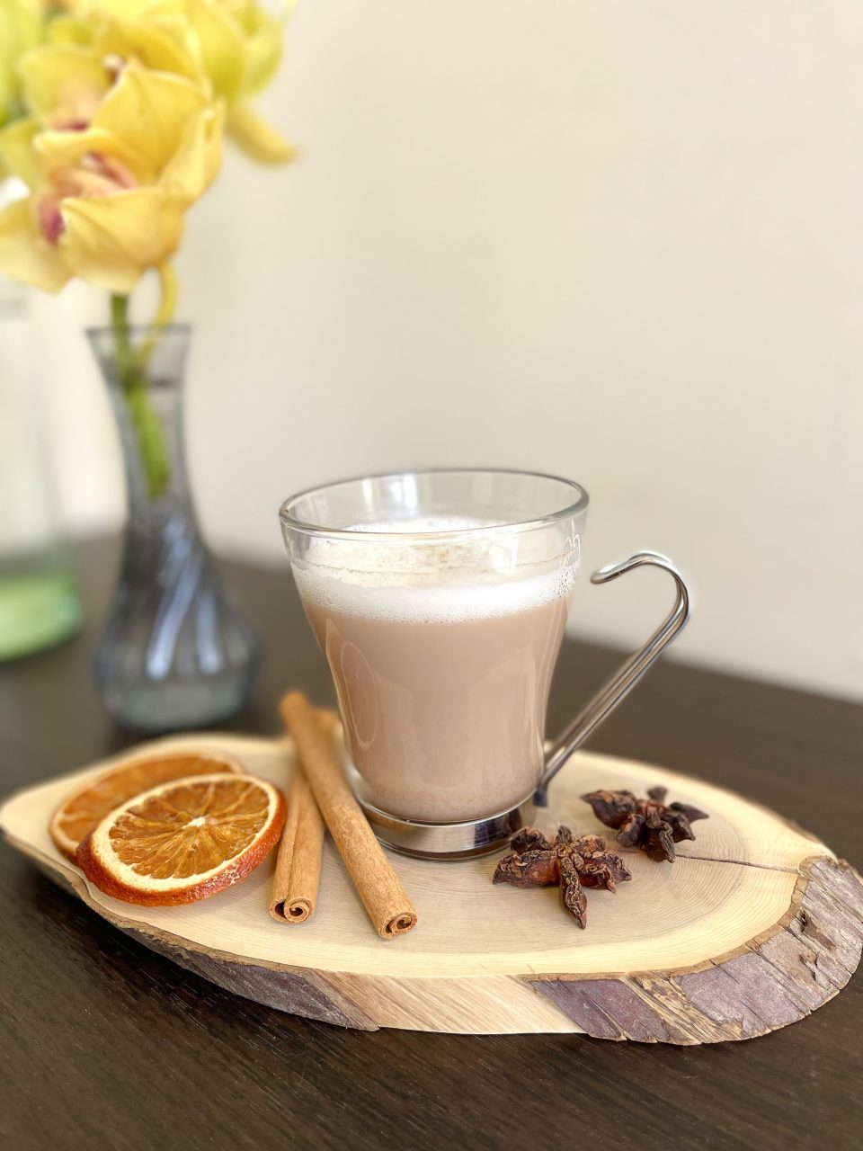 シナモン、カルダモン、ジンジャー、グローブ、スターアニスなどのスパイスと紅茶のアッサムの香りのチャイに、ミルクの優しいカプチーノが出会いました!