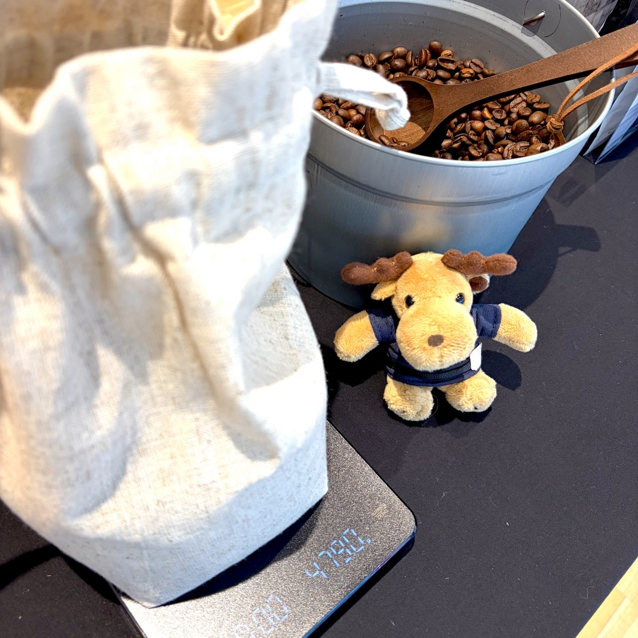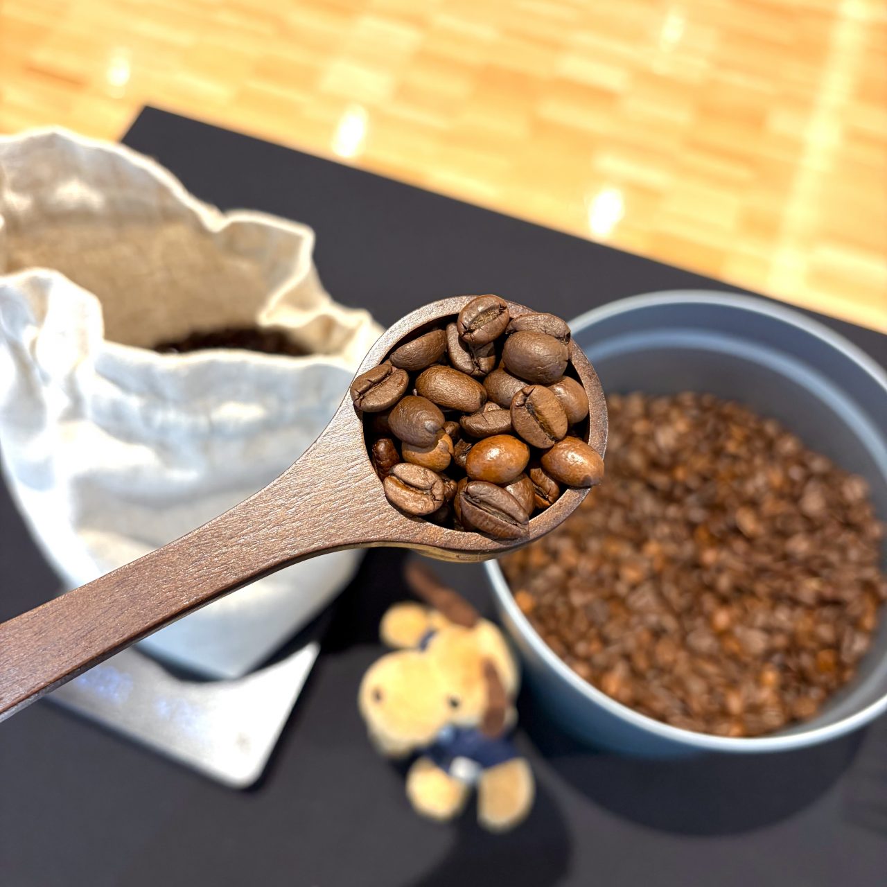 麻袋にコーヒー豆をスプーンで入れていき、
