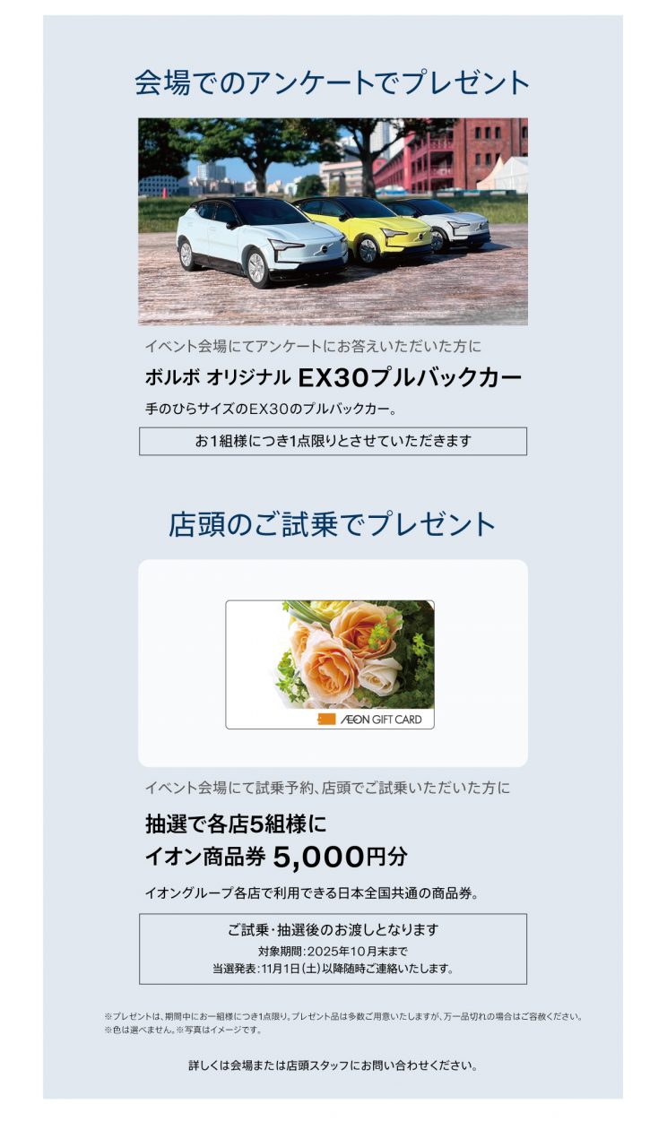 ご来場アンケートにお答えいただいた方には「EX30プルバックカー」をご用意。