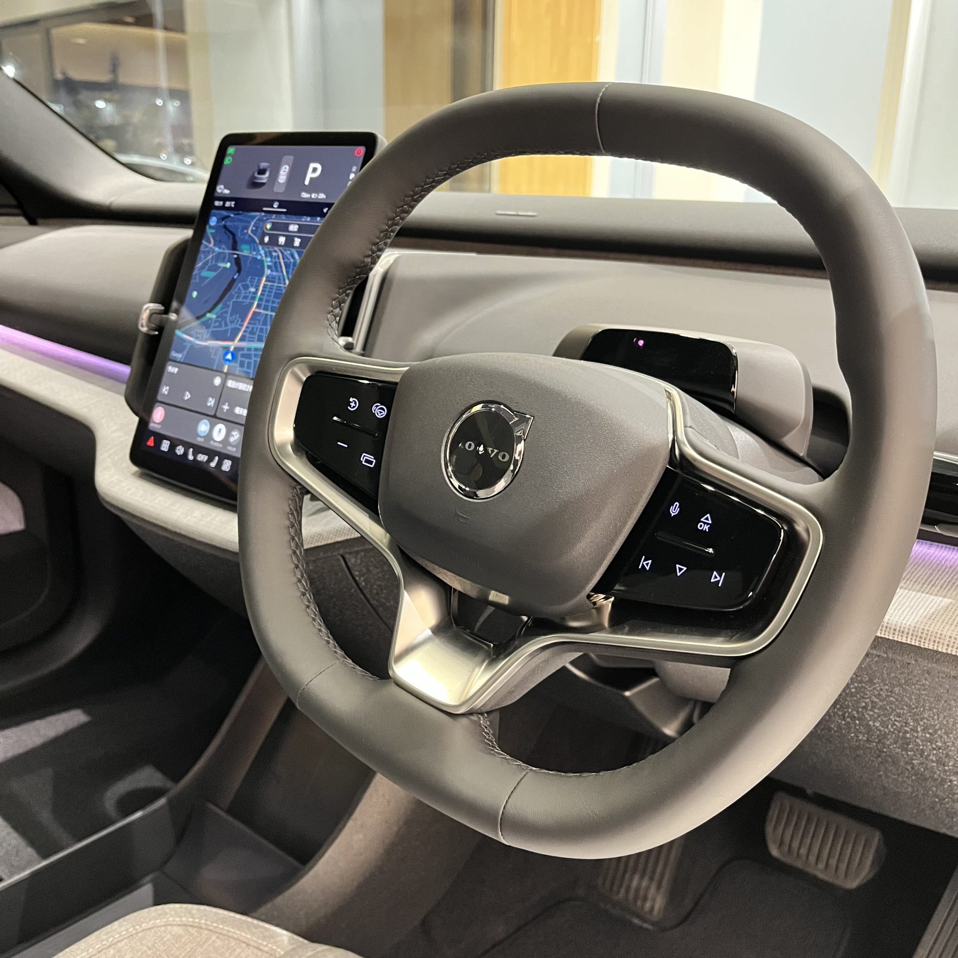 スポーツステアリングホイールのグリップ部には、しっかりとホールドできるスクエアデザインを採用しました。そしてスポーク部には、さまざまな装備や機能を操作できるスイッチをスタイリッシュにレイアウト。一部の機能については、お好みに合わせてスイッチの割り当てをカスタマイズすることも可能です。 寒い朝にうれしいステアリングホイール・ヒーターも完備しています。操作はセンターディスプレイで行いますが、自動的に作動させることも可能です。ステアリングホイール・ヒーターの自動制御は7℃以下で作動するプレコンディショニングプログラムに含まれており、Volvo EX30 appで設定を変更できます。